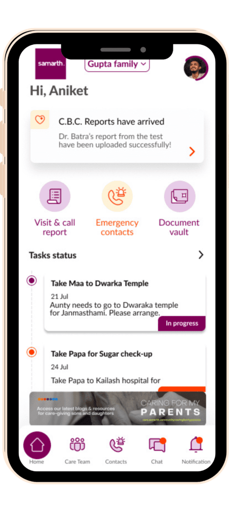 Samarth is a tech-enabled elder care platform that supports seniors across India. It’s built especially for NRIs and Indian families abroad as well as Indians living away from their ageing parents, who want to care for their parents remotely with ease, confidence, and compassion