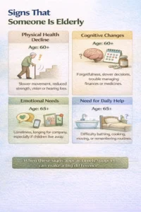 - “Senior Citizen” vs Elderly in Care: A “senior citizen” usually refers to someone who has crossed 60 and is eligible for benefits, while “elderly” often refers to older adults who need care support in daily activities.
