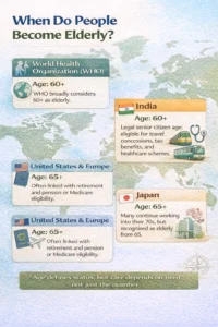 - In India, individuals above 60 years of age are considered senior citizens, entitling them to special schemes, travel concessions, and healthcare benefits.